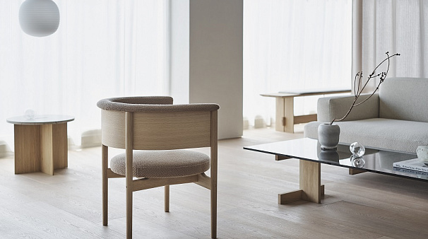На фото представлены ваза Guggenheim, журнальный столик Spider Table от 101 Copenhagen, книгодержатель Laboratory и торшер Daphine Terra LED от Lumina