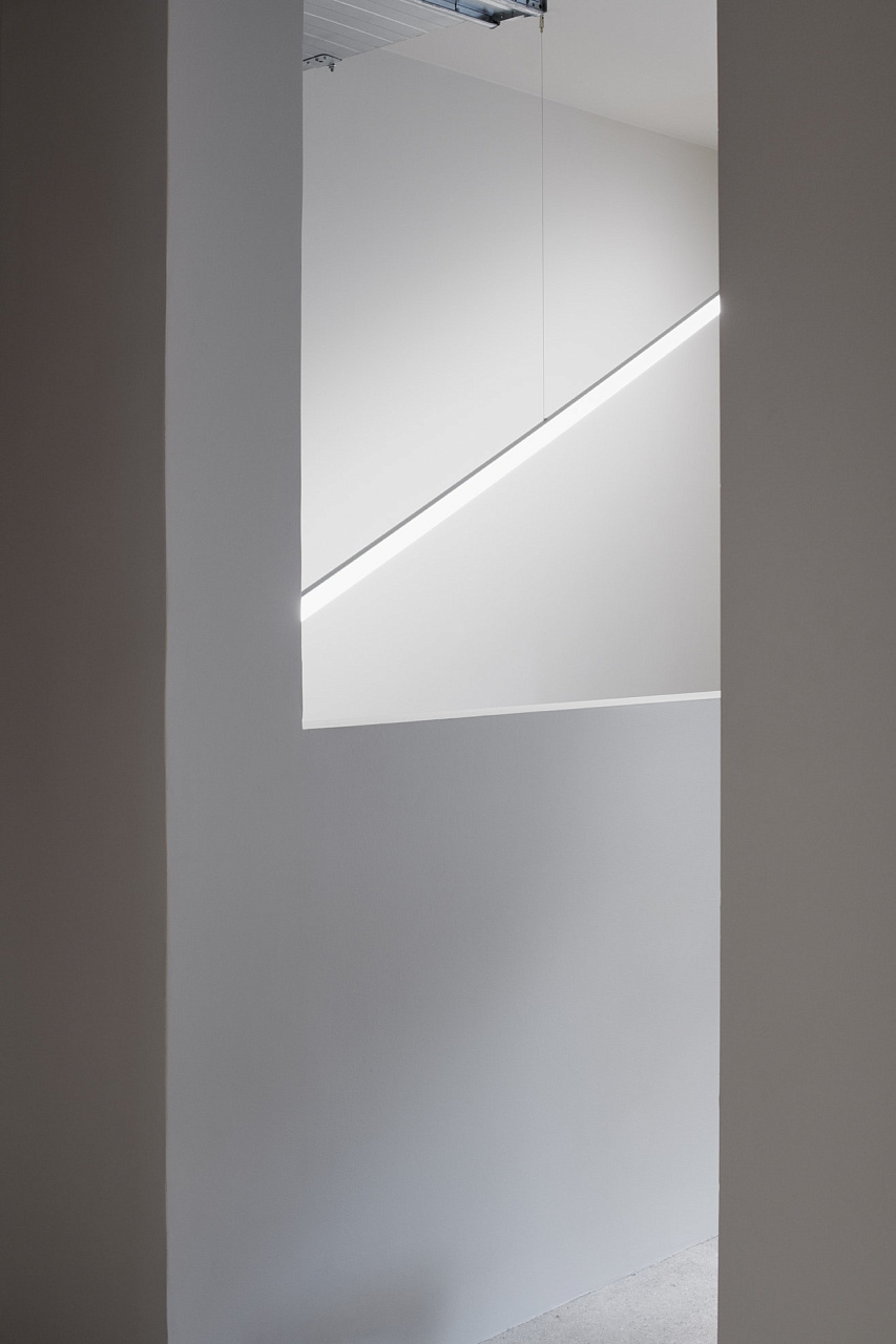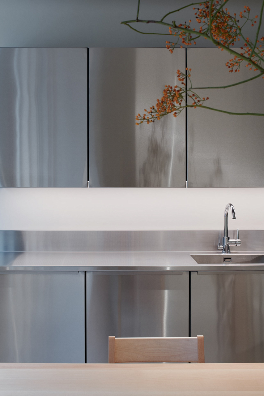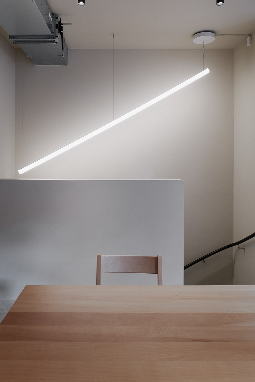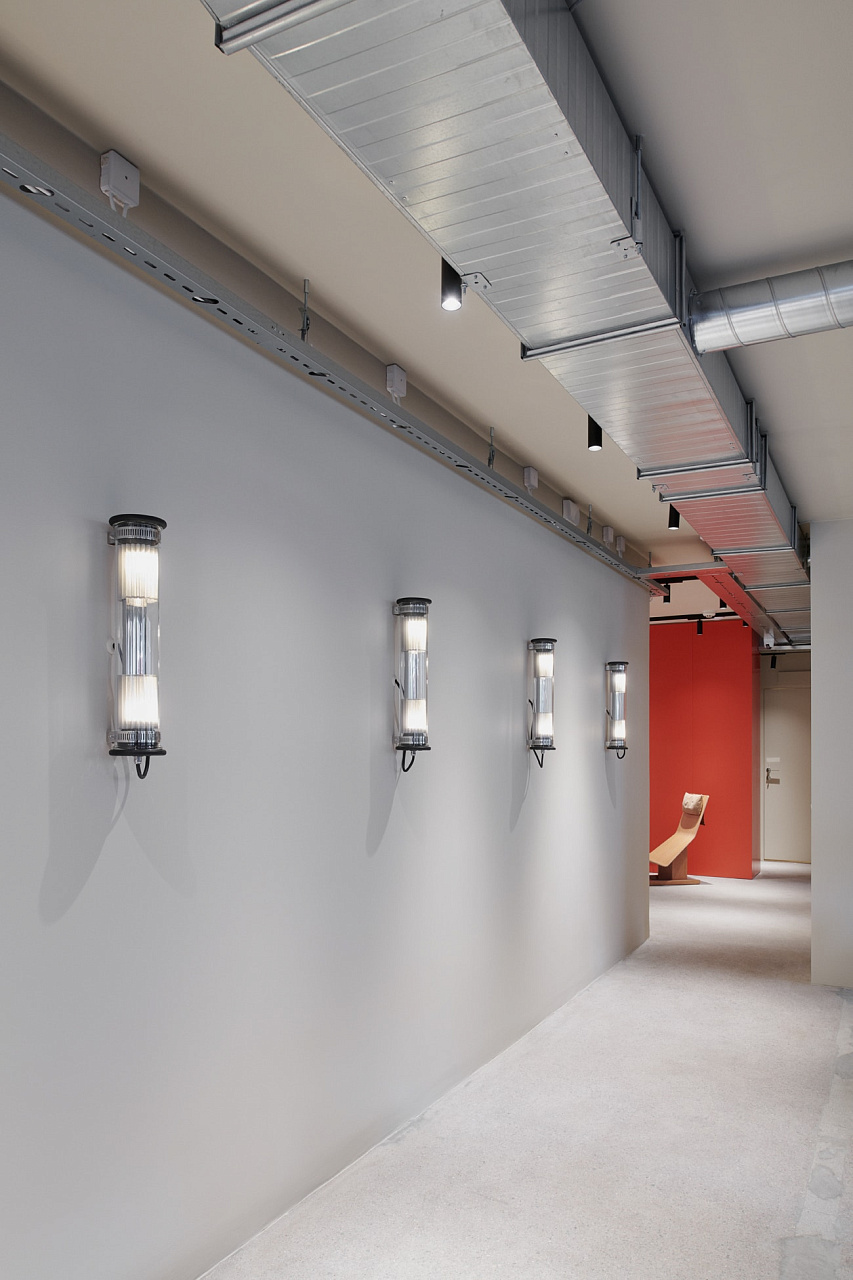 Мебель из натурального дерева сочетается с по-офисному пустым окружением. Вдоль коридоров идут вентиляционные шахты из необработанного металла, что подчёркивает индустриальную атмосферу пространства.
